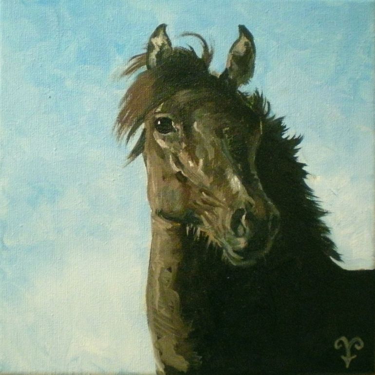 This little equine portrait is a cute little filly which is being trained by my friend S. She came as a very scared little thing, grown up in the wild. She is the offspring of a mare from a free-roaming group of Exmoor ponies, and a naughty spanish stallion who escaped his comfortable lodgings to have a night of hanky-panky with the wild ladies. Who consequently gave birth to a pack of cruzados, all unwanted because the aim was to keep the Exmoors as a pure herd.