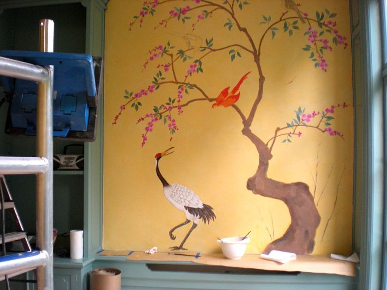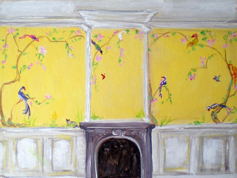 As an inspiration we chose the Chinese wall paper at Nostell Priory. It is exceptionally beautiful, it was supplied by Chippendale who designed the chinoiserie furniture to go with it. It is however very ”busy”. I went for a more balanced custom design to fit the dimensions of the room. Also, the brush strokes, and my ”handwriting” will be clearly discernible.