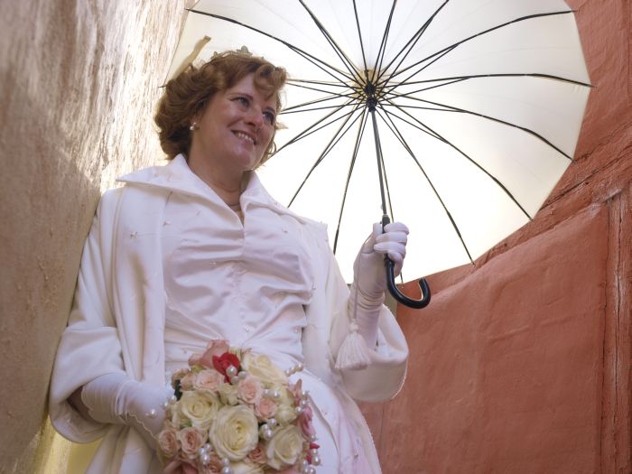 The umbrella is a pagoda umbrella from the excellent Danish designer Lisbeth Dahl, I love the umbrella, and it was particularly appropriate as we got married in Denmark! I am wearing the coat here as well, it is made of a creamy white wool/cashmere blend, and lined with the same fabric as the dress. I did the flowers myself too. I brought the roses from the people at the flower market I have brought my flowers from since I was a student, the ivy (you can’t see it) is an ancient symbol of love, marriage, fidelity and growing together, and it is from my garden. I had three darker pink roses which a friend brought with her, they are a variety called ”Ribe Ruse” or something like that… This is important because we got married in Ribe in Denmark!