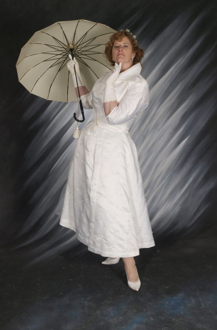 Here I am wearing it all! Trying out the snooty fifties model look! The petticoat was surprisingly warm. The gloves are vintage (the something old) The earrings and necklace were gifts from valued friends, (the something new), and I had sewn a blue ribbon bow inside the dress, and a silver coin.
