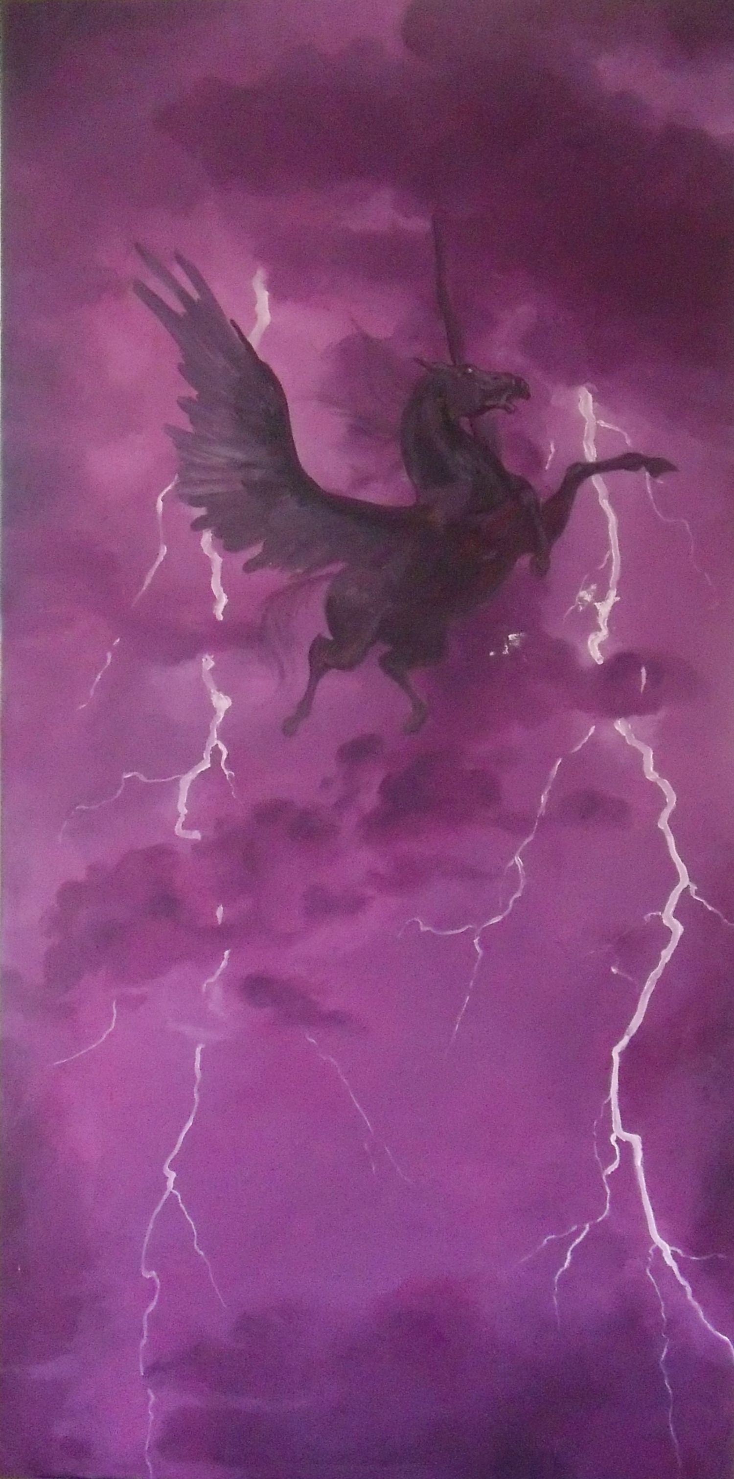 But the pegasus is only in the ground layer. So it looks a bit flat still. As per usual I got some paint from the lightning on my sleeve and smeared it over the sky. I already managed to clean that up. pffffff!