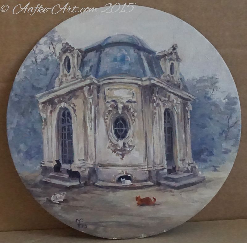 Well, not quite a ”daily painting”, this one took three days. Architecture is a lot of work, and this one is complicated as well. But I really love architecture. From rococo to Mies van der Rohe. (Now that is an idea… a zebra in the Barcelona pavilion). I love this little building, and while I was painting the cats kept popping up, and ended up on the painting. And you will have to imagine that inside the pavilion is filled with small velvet cat-couches, and cats lounging about…