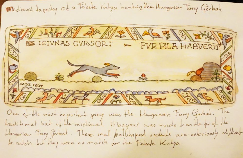 Medieval tapestry, embroidered with coloured wool thread on linnen, showing a Fekete Kutya hunting the Hungarian Furry Gerbil.