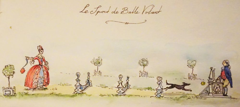 Three jumps, made of concave boards but with a fixed height were put out by the servants on a specially cut grass run, this was named ”La course”, At the end of la course was a square wooden contraption, ”La Boîte qui frapper la Balle”, it contained a rabbit fur covered ball and spring which, when pulled by a servant, would release the fur ball, ”Le Pouff”, in imitation of an Hungarian Furry gerbil. The dog would snap up the ”Pouff” and run back to it’s handler, who also had a Pouff on a silk ribbon, which was meant to entice the dog back and reward the dog by having another ”Pouff” to catch.