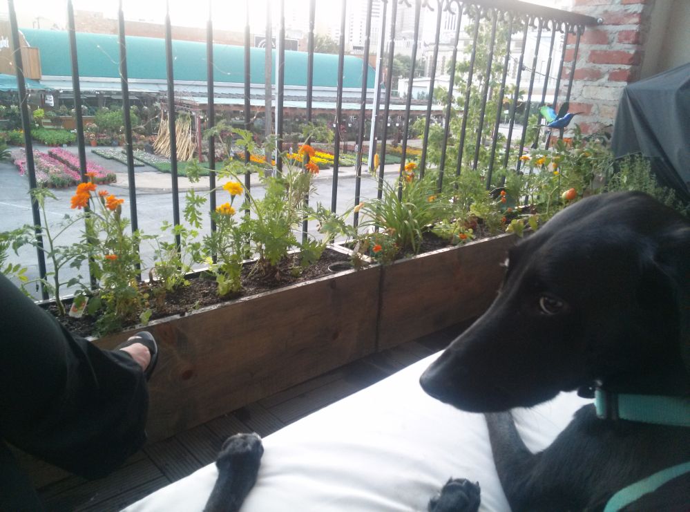 So here’s the plan, Part 1 replace the window boxes on the balcony. Part 2 the window boxes in front of my studio windows, Part 3 build a roof garden on top of the house on the deck.