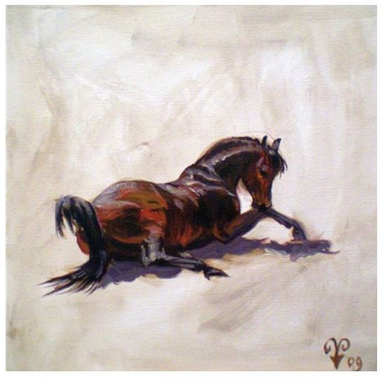 The ”Why” is more difficult. I paint because I hope to make the world a better place. Some of my paintings show the world slightly enhanced. I am happy when I am making beautiful paintings. When I see something beautiful or interesting I want to paint it. For me a horse is about as beautiful as it gets, the lines, shape, movement. Their minds, the wonderful feeling of being carried on the back of a horse, and those few moments when you are in perfect balance with a completely different being. Everything about horses is fascinating to me, and so I will never get tired in painting them.